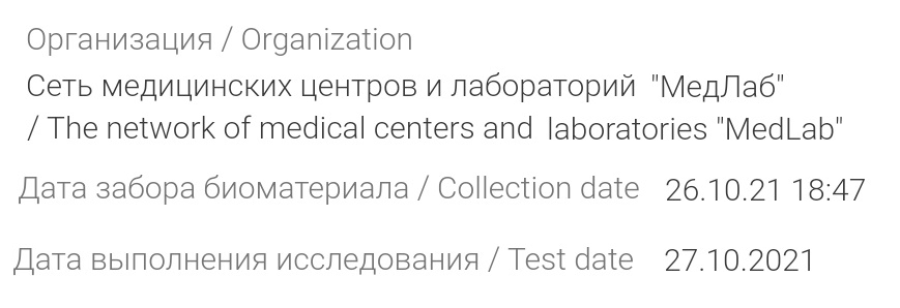 - Далее указана организация в которой был выполнен анализ дата забора биоматериала и дата выполнения исследования.